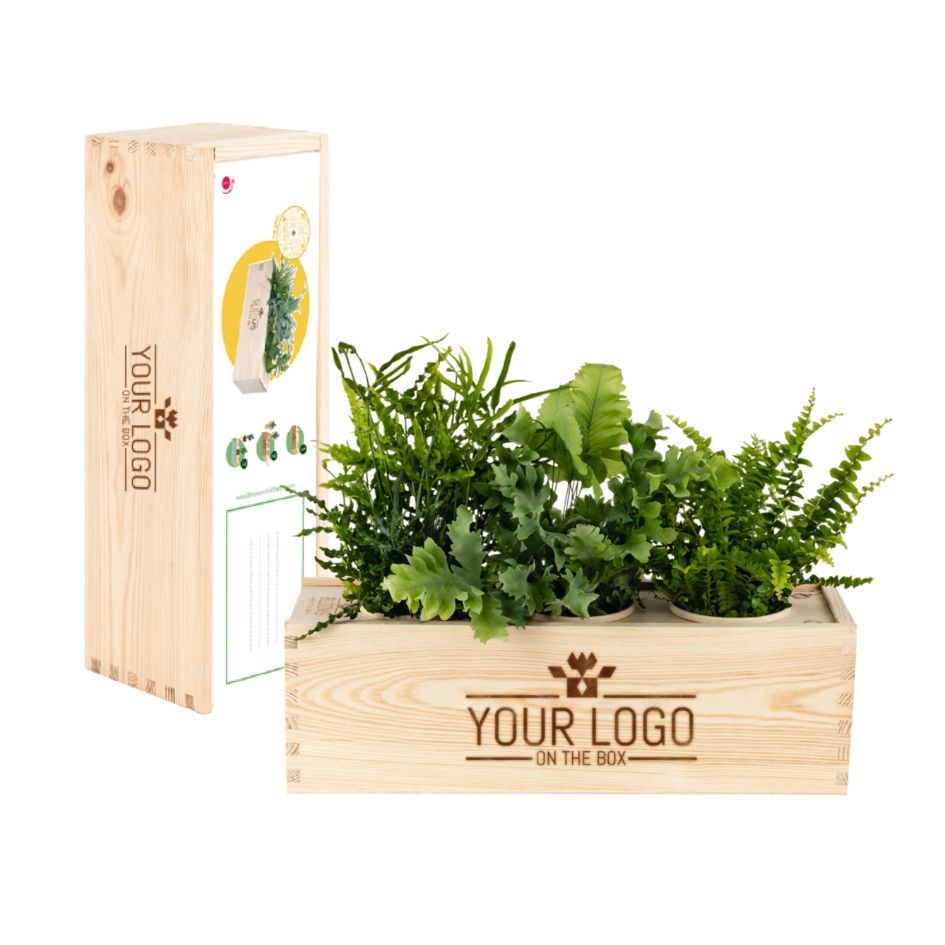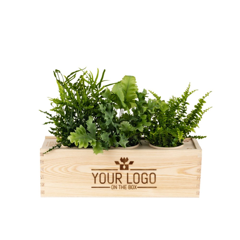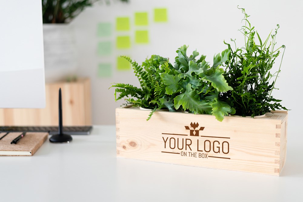 Geef planten cadeau! Deze robuuste houten kist met planten is een duurzaam plant-cadeau met een 3-in-1 design. De houten box is namelijk niet alleen de plantenpot, het is ook de verzendverpakking én het waterreservoir voor de planten. Je geeft zo verpakkingsvrij planten cadeau en dankzij het slimme watergeefsysteem heeft de ontvanger geen omkijken naar de planten. In de houten box graveren we jouw logo of slogan naar keuze. Daardoor sta je met dit groene eco-cadeau maandenlang in de spotlighths bij jouw klanten en collega's. En wat dit cadeau extra bijzonder maakt: bij het maken van dit cadeau worden we geholpen door mensen met een achterstand tot de arbeidsmarkt. Je verrast met dit groene cadeau dus niet alleen de ontvangers, ook de makers worden blij van jouw cadeau!