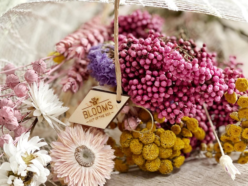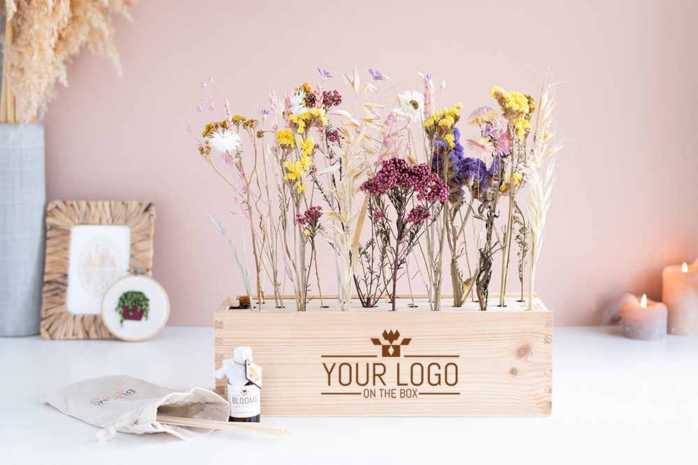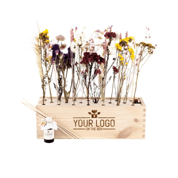 | Materiaal: | Houten kistje (41 x 13 x 13 cm) gevuld met een fleurig boeket droogbloemen en geurolie. Het fsc-houten kistje is zowel de verzendverpakking als de vaas voor de bloemen en geurstokjes. We gebruiken alleen duurzame, waar mogelijk gerecyclede materialen en compenseren de (beperkte) carbon footprint van de Boxen. |