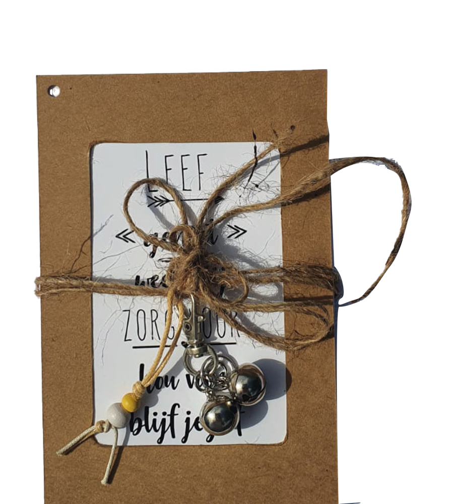 Om het helemaal af te maken wordt een handgemaakt Tinkle Alarm of gelukspoppetje aan toe gevoegd.