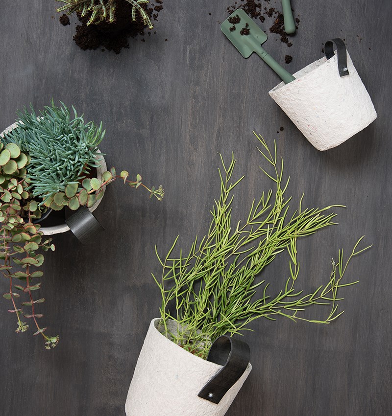 De Paper Pot Set bestaat uit twee stoere betonlook bloempotten. Deze duurzame papieren potten worden met de hand gemaakt van oude kranten. Door de stoere zwarte lus van oude autobanden krijgen ze hun eigen unieke karakter. Je kunt de bloempot neerzetten of ophangen. Het advies is om een dichte binnenpot erbij te gebruiken. Maat kleine pot Ø 16 x 16 cm/ grote pot Ø 21 x 19 cm