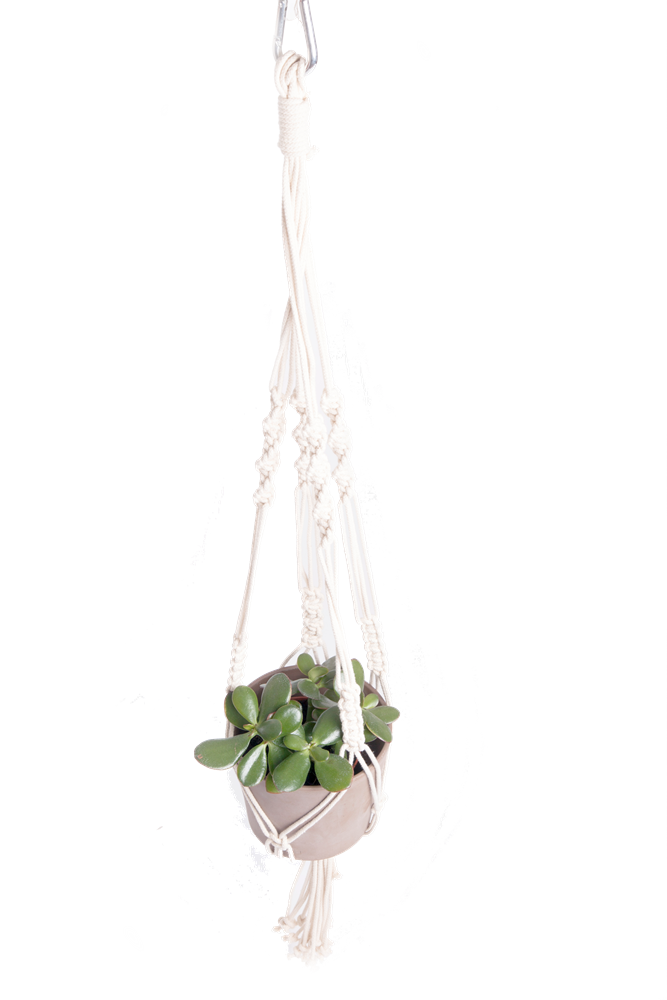 Ooit bedoeld om je tent op te zetten, nu een moderne, vintage geïnspireerde macramé planthanger. Deze plantenhouders zijn eenvoudig, maar zorgvuldig met de hand gemaakt van restanten scheerlijnen in een sociale werkplaats.