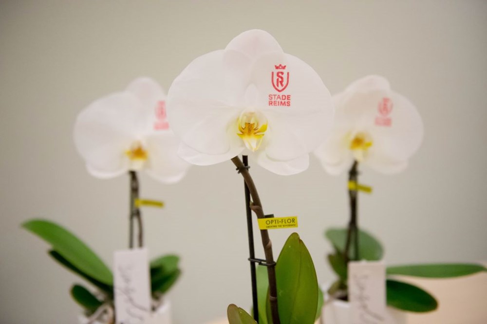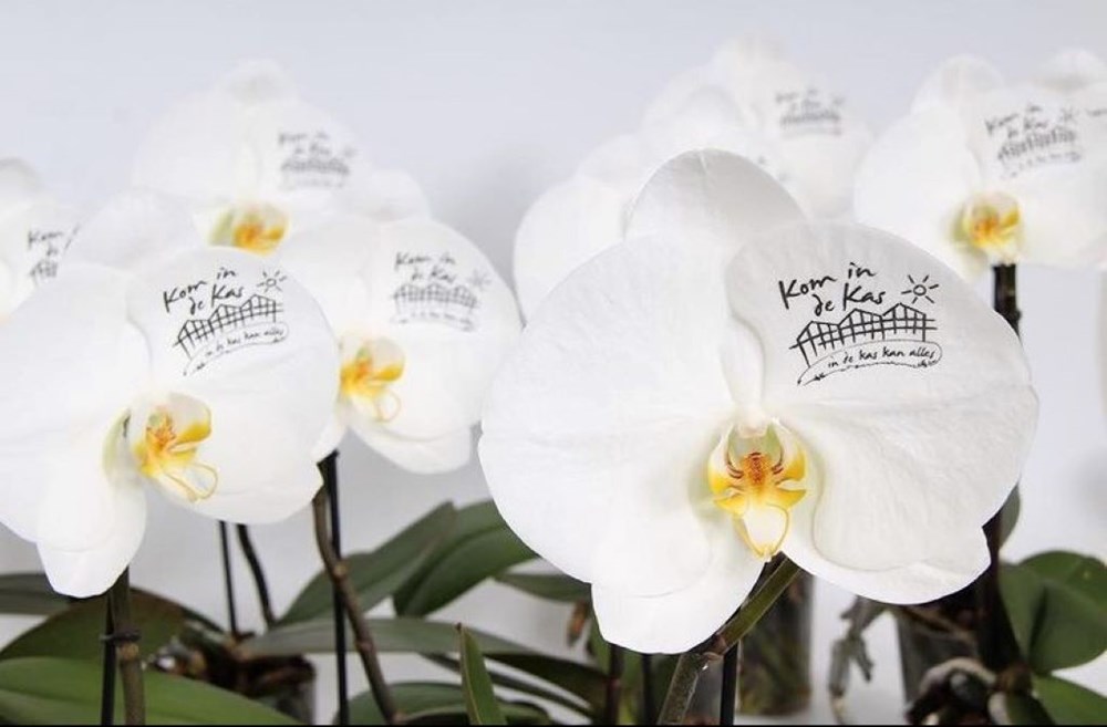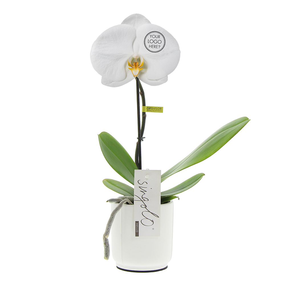 Opdruk informatietekst: Éénkleurige bedrukking op de witte bloem in een standaardkleur: zwart, blauw, groen, rood, roze, geel, paars, oranje, goud, zilver. Dankzij speciale technieken heeft dit geen invloed op de levensduur van de plant. Zolang de plant gezond is en goed wordt onderhouden, blijft de opdruk duidelijk zichtbaar, zonder te vervagen. Dit betekent dat jouw opdruk langdurig in beeld blijft.