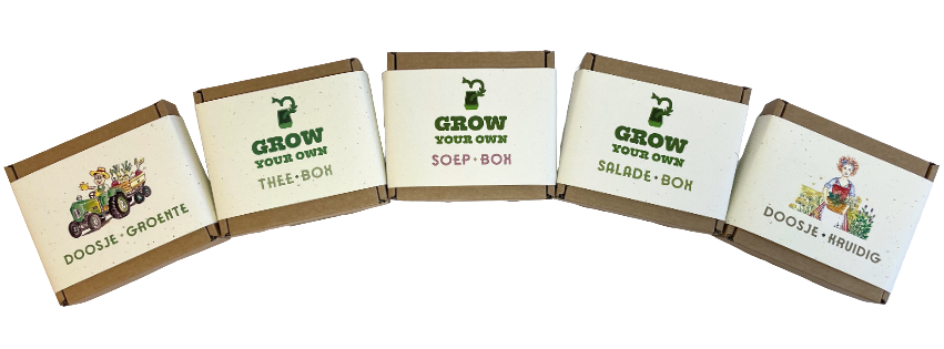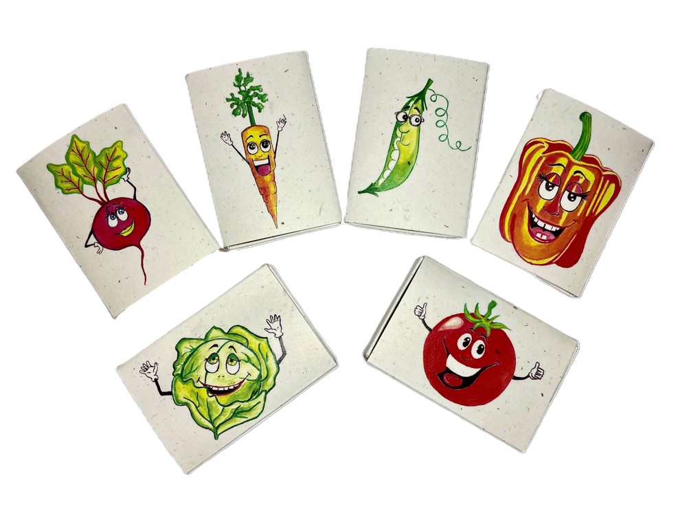 Deze vrolijke doosjes zijn gemaakt van het afval van tomatenplanten. Ieder doosje is gevuld met biologische groente zaadjes verstopt in biologische, turfvrije aarde. Je kunt de zaadjes kweken in het doosje zelf. Als de plantjes groeien zet je ze in een groter potje, daarna naar buiten. De volledig gebruiksaanwijzing staat op de binnenzijde van ieder doosje. Alles is met zorg ontworpen, bedacht, getekend en gemaakt in een sociale onderneming.