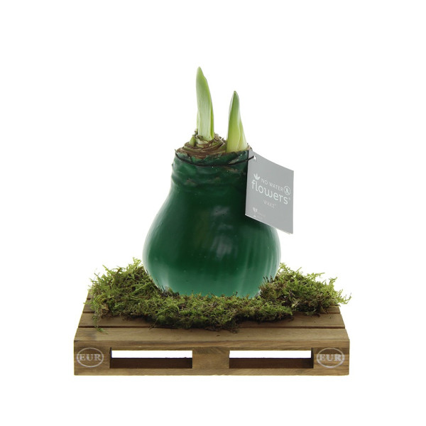 No Water Flowers® zijn een luxe, groeiend en bloeiend geschenk. De levende No Water Flowers® staan bekend om de unieke handgemaakte wax amaryllisbollen. Deze speciaal geselecteerde en geteste amaryllisbollen hebben genoeg energie om zonder water te groeien en te bloeien. Authentieke No Water Flowers® geven vrij korte bloemstelen, vallen niet om en bloeien gegarandeerd. Iedere No Water Flowers® wordt zorgvuldig schoongemaakt en tot in perfectie gewaxt. Dit geeft de bloembol een eigentijdse en modieuze uitstraling. Deze No Water Flowers® is geplaatst op een gaaf mini palletje wat een stoere en gave verschijning is. Super tof voor bijvoorbeeld de logistieke sector. Bovendien zorgt dit ervoor dat de amaryllisbol extra stevig staat.