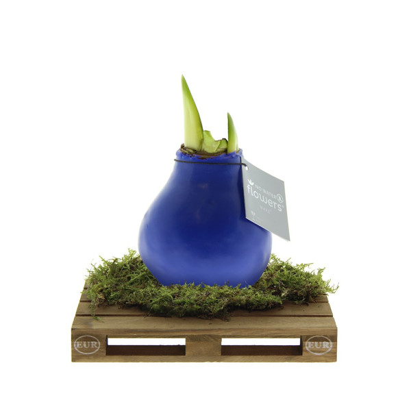 No Water Flowers® zijn een luxe, groeiend en bloeiend geschenk. De levende No Water Flowers® staan bekend om de unieke handgemaakte wax amaryllisbollen. Deze speciaal geselecteerde en geteste amaryllisbollen hebben genoeg energie om zonder water te groeien en te bloeien. Authentieke No Water Flowers® geven vrij korte bloemstelen, vallen niet om en bloeien gegarandeerd. Iedere No Water Flowers® wordt zorgvuldig schoongemaakt en tot in perfectie gewaxt. Dit geeft de bloembol een eigentijdse en modieuze uitstraling. Deze No Water Flowers® is geplaatst op een gaaf mini palletje wat een stoere en gave verschijning is. Super tof voor bijvoorbeeld de logistieke sector. Bovendien zorgt dit ervoor dat de amaryllisbol extra stevig staat.