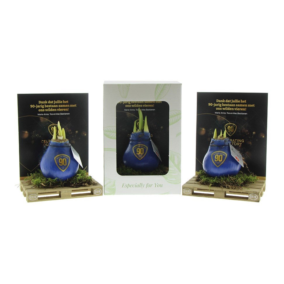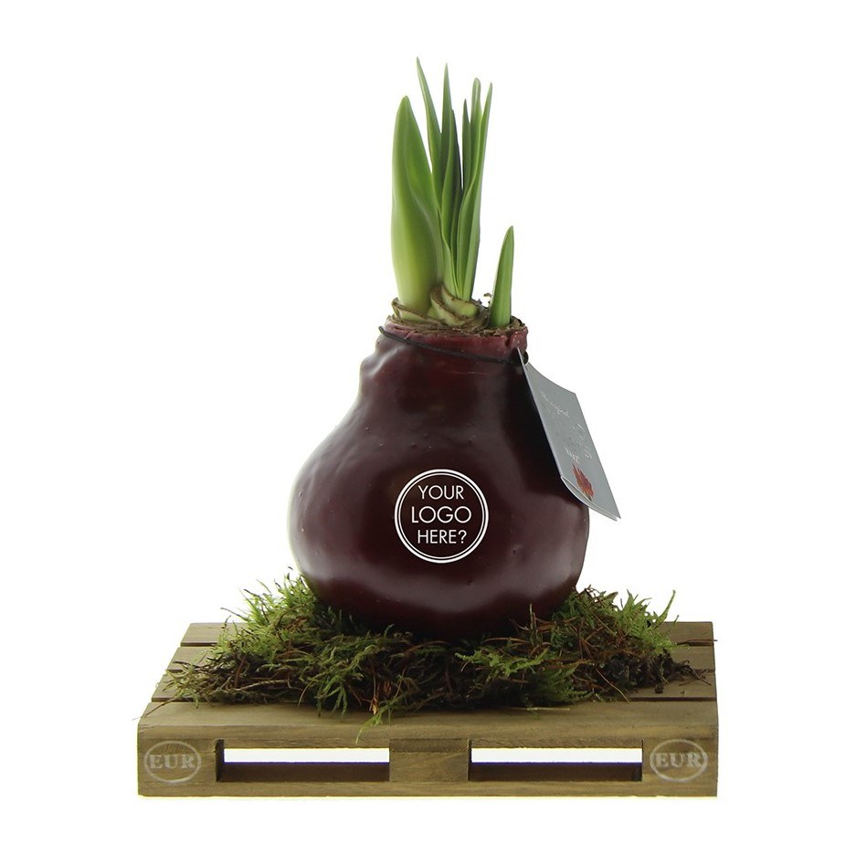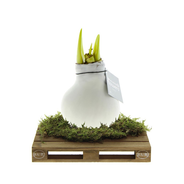 No Water Flowers® zijn een luxe, groeiend en bloeiend geschenk. De levende No Water Flowers® staan bekend om de unieke handgemaakte wax amaryllisbollen. Deze speciaal geselecteerde en geteste amaryllisbollen hebben genoeg energie om zonder water te groeien en te bloeien. Authentieke No Water Flowers® geven vrij korte bloemstelen, vallen niet om en bloeien gegarandeerd. Iedere No Water Flowers® wordt zorgvuldig schoongemaakt en tot in perfectie gewaxt. Dit geeft de bloembol een eigentijdse en modieuze uitstraling. Deze No Water Flowers® is geplaatst op een gaaf mini palletje wat een stoere en gave verschijning is. Super tof voor bijvoorbeeld de logistieke sector. Bovendien zorgt dit ervoor dat de amaryllisbol extra stevig staat.