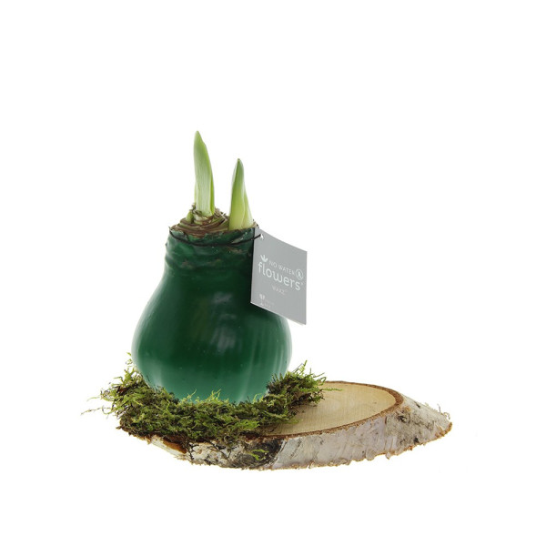 No Water Flowers® zijn een luxe, groeiend en bloeiend geschenk. De levende No Water Flowers® staan bekend om de unieke handgemaakte wax amaryllisbollen. Deze speciaal geselecteerde en geteste amaryllisbollen hebben genoeg energie om zonder water te groeien en te bloeien. Authentieke No Water Flowers® geven vrij korte bloemstelen, vallen niet om en bloeien gegarandeerd. Iedere No Water Flowers® wordt zorgvuldig schoongemaakt en tot in perfectie gewaxt. Dit geeft de bloembol een eigentijdse en modieuze uitstraling. Deze No Water Flowers® is geplaatst op een natuurlijke berken schijf met een laagje natuurlijk mos, wat het geheel een huiselijke uitstraling geeft. Bovendien zorgt dit ervoor dat de amaryllisbol extra stevig staat.