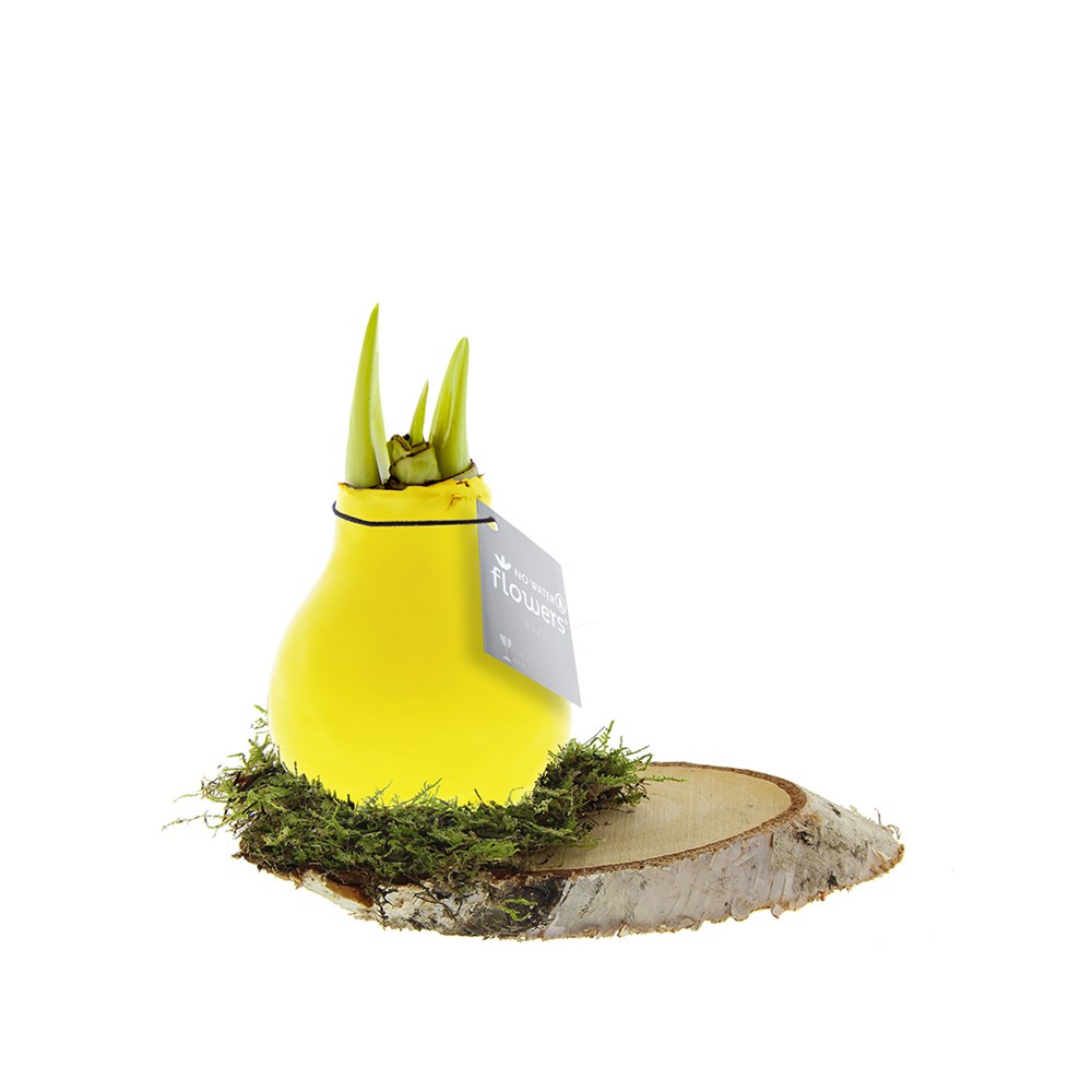 No Water Flowers® zijn een luxe, groeiend en bloeiend geschenk. De levende No Water Flowers® staan bekend om de unieke handgemaakte wax amaryllisbollen. Deze speciaal geselecteerde en geteste amaryllisbollen hebben genoeg energie om zonder water te groeien en te bloeien. Authentieke No Water Flowers® geven vrij korte bloemstelen, vallen niet om en bloeien gegarandeerd. Iedere No Water Flowers® wordt zorgvuldig schoongemaakt en tot in perfectie gewaxt. Dit geeft de bloembol een eigentijdse en modieuze uitstraling. Deze No Water Flowers® is geplaatst op een natuurlijke berken schijf met een laagje natuurlijk mos, wat het geheel een huiselijke uitstraling geeft. Bovendien zorgt dit ervoor dat de amaryllisbol extra stevig staat.