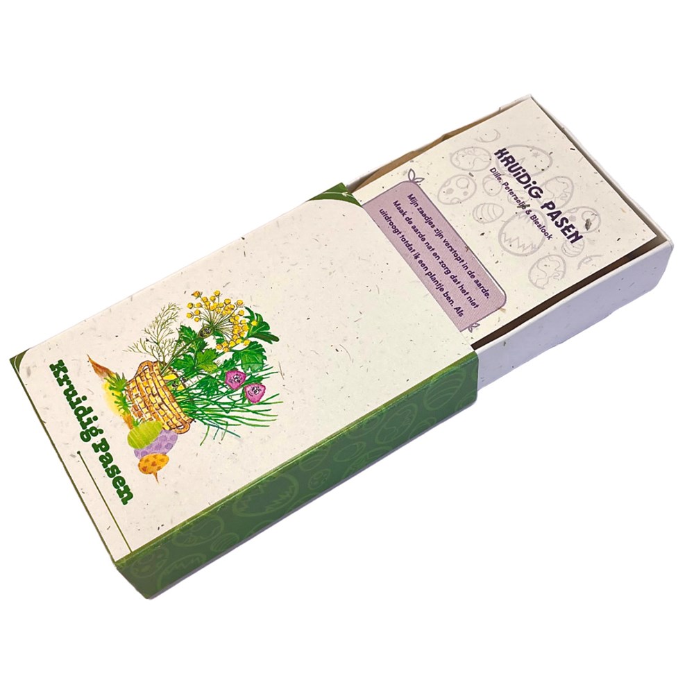 | Materiaal: | Tomatenvezelpapier, biologische zaadjes, biologische turfvrije aarde |