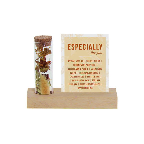 Deze stijlvolle droogbloemvariant bestaat uit één glazen buisje gevuld met kleurrijke droogbloemen, gepresenteerd op een houten standaard met sleuf voor een los A7-kaartje. Zowel het kaartje als het houten blokje kunnen volledig gepersonaliseerd worden met bijvoorbeeld een logo, slogan of boodschap in jouw huisstijl. Bij dit artikel is het A7-kaartje zoals op de foto standaard inbegrepen. Wil je in plaats daarvan een eigen gepersonaliseerd kaartje in full color toevoegen? Kies dan de personalisatie-optie, je betaalt alleen de opstartkosten voor het bedrukken.