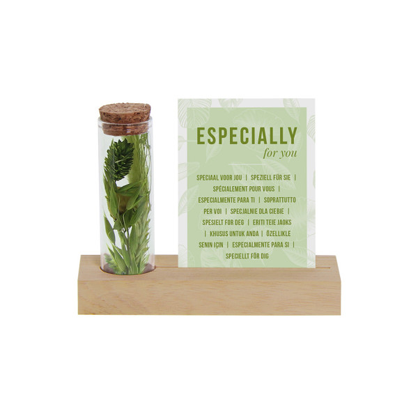 Deze stijlvolle droogbloemvariant bestaat uit één glazen buisje gevuld met kleurrijke droogbloemen, gepresenteerd op een houten standaard met sleuf voor een los A7-kaartje. Zowel het kaartje als het houten blokje kunnen volledig gepersonaliseerd worden met bijvoorbeeld een logo, slogan of boodschap in jouw huisstijl. Bij dit artikel is het A7-kaartje zoals op de foto standaard inbegrepen. Wil je in plaats daarvan een eigen gepersonaliseerd kaartje in full color toevoegen? Kies dan de personalisatie-optie, je betaalt alleen de opstartkosten voor het bedrukken.