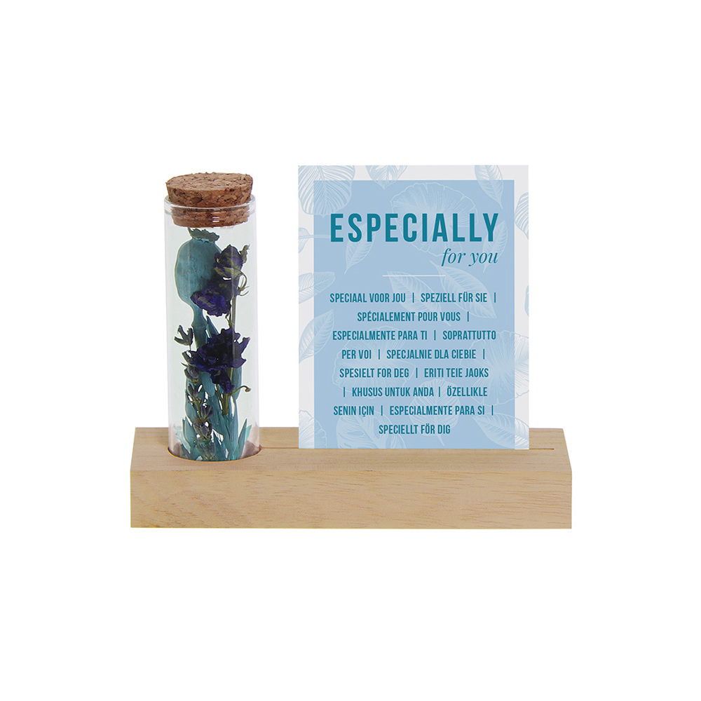 Deze stijlvolle droogbloemvariant bestaat uit één glazen buisje gevuld met kleurrijke droogbloemen, gepresenteerd op een houten standaard met sleuf voor een los A7-kaartje. Zowel het kaartje als het houten blokje kunnen volledig gepersonaliseerd worden met bijvoorbeeld een logo, slogan of boodschap in jouw huisstijl. Bij dit artikel is het A7-kaartje zoals op de foto standaard inbegrepen. Wil je in plaats daarvan een eigen gepersonaliseerd kaartje in full color toevoegen? Kies dan de personalisatie-optie, je betaalt alleen de opstartkosten voor het bedrukken.