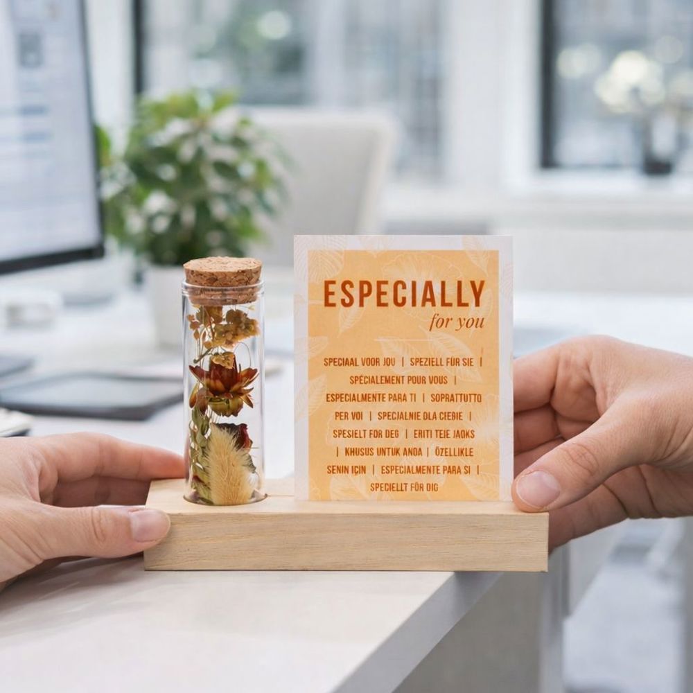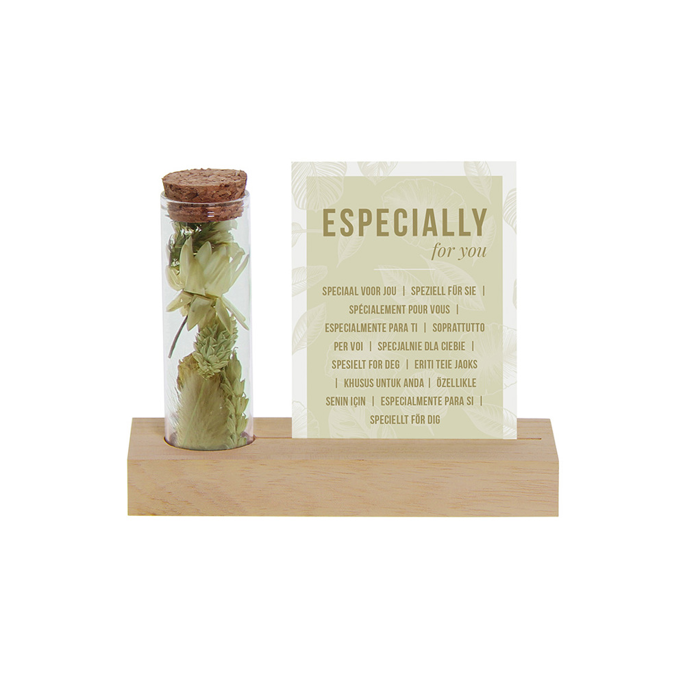 Deze stijlvolle droogbloemvariant bestaat uit één glazen buisje gevuld met kleurrijke droogbloemen, gepresenteerd op een houten standaard met sleuf voor een los A7-kaartje. Zowel het kaartje als het houten blokje kunnen volledig gepersonaliseerd worden met bijvoorbeeld een logo, slogan of boodschap in jouw huisstijl. Bij dit artikel is het A7-kaartje zoals op de foto standaard inbegrepen. Wil je in plaats daarvan een eigen gepersonaliseerd kaartje in full color toevoegen? Kies dan de personalisatie-optie, je betaalt alleen de opstartkosten voor het bedrukken.