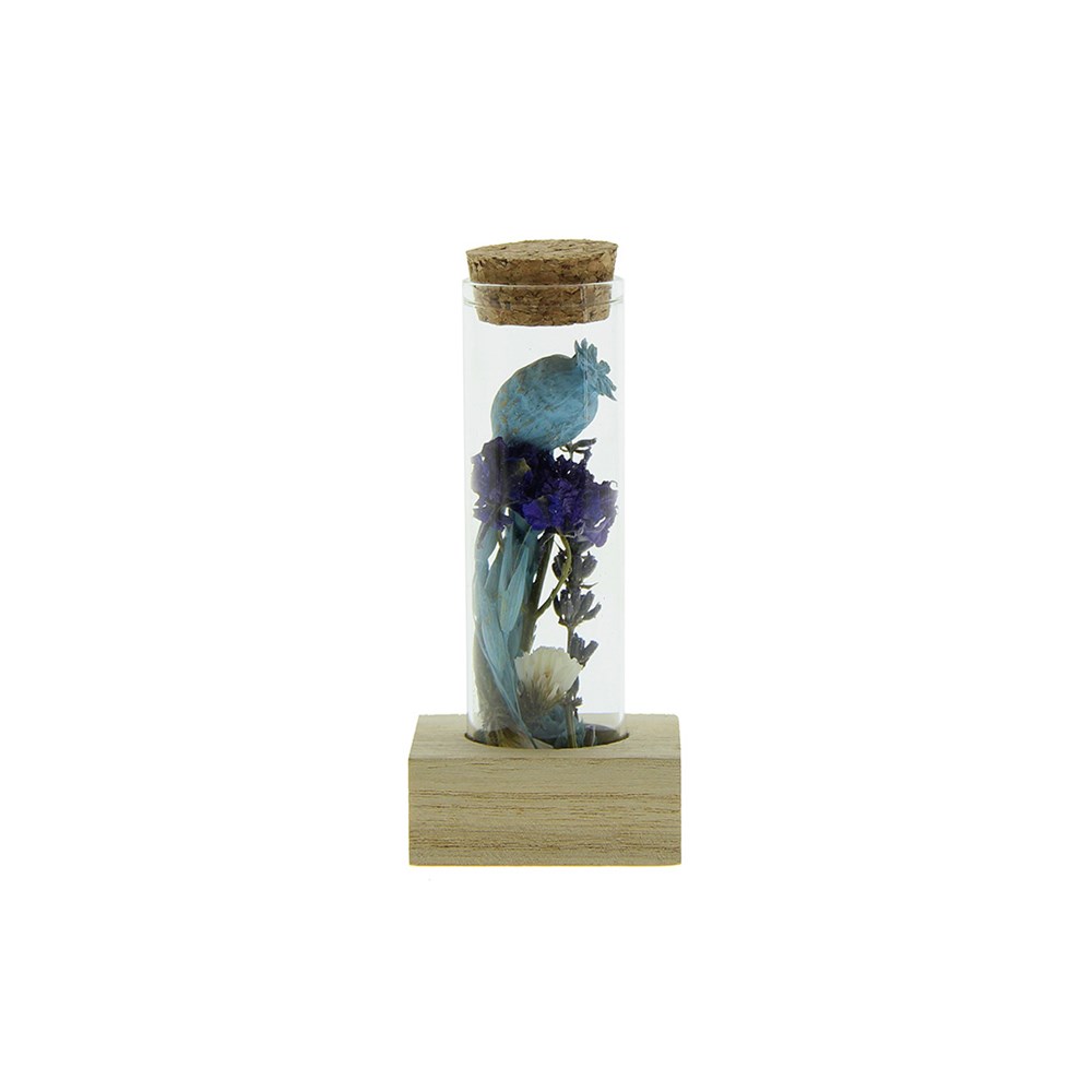 Een compact en elegant geschenk met impact: deze droogbloemvariant bestaat uit één glazen buisje gevuld met lang houdbare droogbloemen in kleuren die passen bij jouw huisstijl. Het buisje staat stevig op een houten standaard die gepersonaliseerd kan worden met een logo, bedrijfsnaam of korte boodschap.