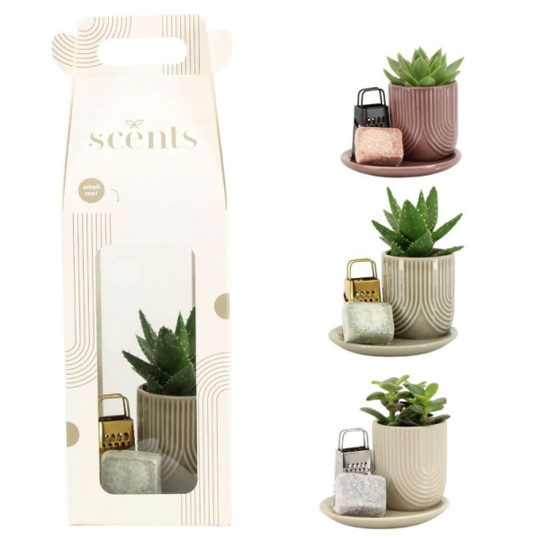 Ervaar de luxe van een geschenk dat de zintuigen prikkelt met verleidelijke geuren en een natuurlijke uitstraling. De Aromatic Giftset small biedt een perfecte mix van natuurlijke schoonheid en heerlijke geuren, ideaal voor elke gelegenheid. Deze set bestaat uit een stijlvolle schaal, een plant in een keramieke pot, een ambergeurblokje en een bijbehorende schaaf. De gehele set is sierlijk verpakt in een kartonnen verpakking in de mix van drie kleuren met een transparant display, direct klaar om cadeau te geven.