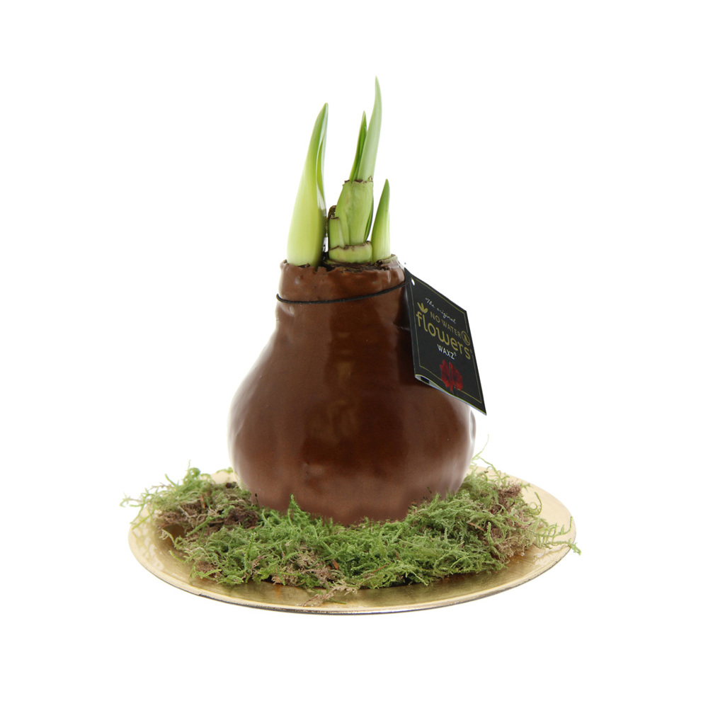 No Water Flowers® zijn een luxe, groeiend en bloeiend geschenk. De levende No Water Flowers® staan bekend om de unieke handgemaakte wax amaryllisbollen. Deze speciaal geselecteerde en geteste amaryllisbollen hebben genoeg energie om zonder water te groeien en te bloeien. Authentieke No Water Flowers® geven vrij korte bloemstelen, vallen niet om en bloeien gegarandeerd. Iedere No Water Flowers® wordt zorgvuldig schoongemaakt en tot in perfectie gewaxt. Dit geeft de bloembol een eigentijdse en modieuze uitstraling. Deze No Water Flowers® is geplaatst op een gouden schaal wat een luxe uitstraling met zich meebrengt, een gaaf geschenk voor jouw belangrijke relaties. Bovendien zorgt dit ervoor dat de amaryllisbol extra stevig staat.