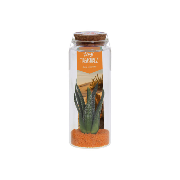 De Tiny Treasurez® Message in a bottle large is een originele groene give-away, perfect als relatiegeschenk tijdens evenementen, beurzen, themadagen of bedankmomenten. In het glazen flesje bevindt zich een laagje zand of gekleurd grind, een sfeerkaartje met informatie over de Tiny Treasurez en natuurlijk de levende mini-succulent. Het standaard kaartje kan desgewenst worden vervangen of gepersonaliseerd met een eigen boodschap. Ook de sluitsticker op de fles kan gepersonaliseerd worden.