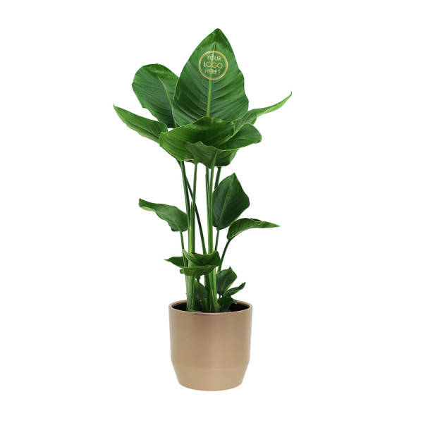 Deze indrukwekkende plant, beter bekend als de "Bird of Paradise", straalt luxe en exclusiviteit uit. Met de juiste verzorging – voldoende licht, regelmatige watergift en een stabiele temperatuur – behoudt deze Strelitzia zijn frisse uitstraling en gaat hij jarenlang mee. Daarnaast werkt de plant luchtzuiverend en draagt hij bij aan een gezondere werkomgeving. Dankzij het grote personalisatieoppervlak op een opvallend blad kan jouw logo, slogan of boodschap in stijlvol goud worden aangebracht, voor langdurige zichtbaarheid. Onderscheid je met deze Strelitzia: meer dan een frisse plant, een persoonlijk geschenk dat indruk maakt en blijvende waarde toevoegt.
