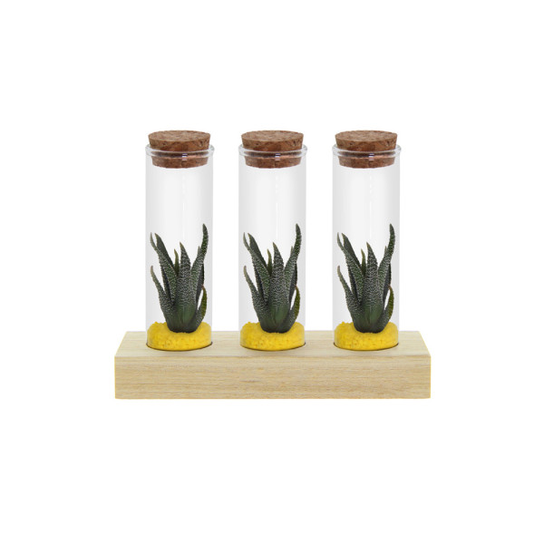 Deze luxe uitvoering bevat drie glazen flesjes, elk gevuld met levende mini-succulenten in een laagje zand of gekleurd grind. De flesjes zijn stijlvol gepresenteerd op een houten standaard die ruimte biedt voor personalisatie, bijvoorbeeld met een logo, bedrijfsnaam of korte boodschap.