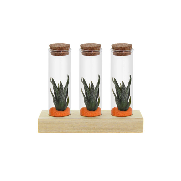 Deze luxe uitvoering bevat drie glazen flesjes, elk gevuld met levende mini-succulenten in een laagje zand of gekleurd grind. De flesjes zijn stijlvol gepresenteerd op een houten standaard die ruimte biedt voor personalisatie, bijvoorbeeld met een logo, bedrijfsnaam of korte boodschap.