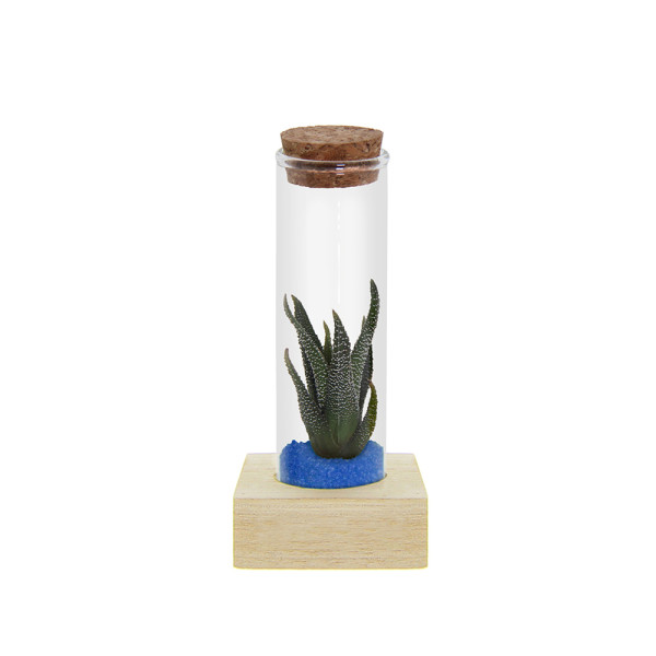 Deze variant van de Tiny Treasurez® wordt gepresenteerd in een klein glazen flesje, geplaatst op een houten standaard. Het flesje bevat levende mini-succulenten in een laagje zand of gekleurd grind. De houten standaard biedt ruimte voor personalisatie met bijvoorbeeld een logo, naam of korte boodschap.