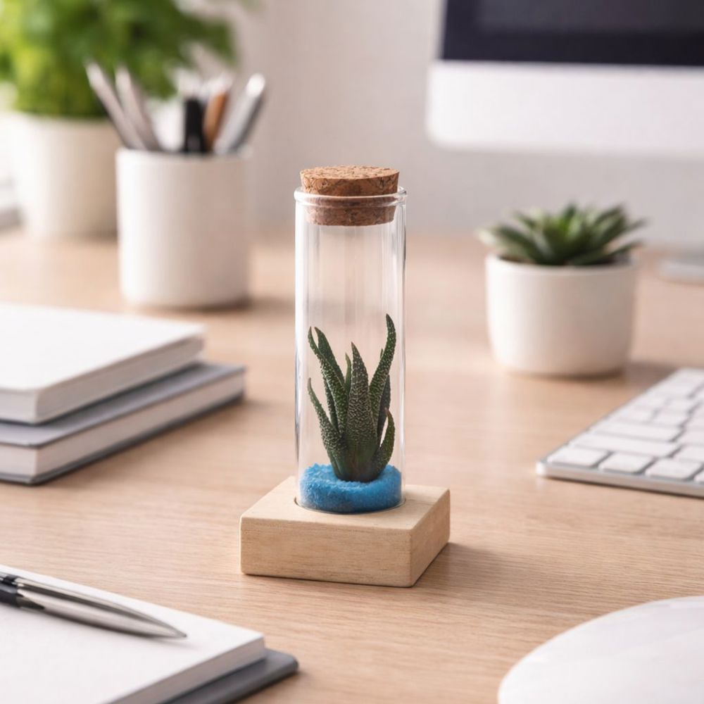 Deze variant van de Tiny Treasurez® wordt gepresenteerd in een klein glazen flesje, geplaatst op een houten standaard. Het flesje bevat levende mini-succulenten in een laagje zand of gekleurd grind. De houten standaard biedt ruimte voor personalisatie met bijvoorbeeld een logo, naam of korte boodschap.