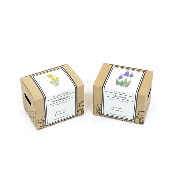 Duurzame kartonnen doosjes met bloembollen naar keuze en label met uw eigen logo of in de kleuren...meer