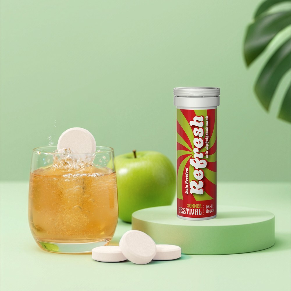 Deze bruisende tabletten met appelsmaak leveren belangrijke elektrolyten zoals kalium, magnesium en calcium, evenals de vitamines B1, B2 en B6. Ze helpen het mineraalevenwicht te behouden tijdens periodes van hogere lichamelijke activiteit of na lange nachten. De caloriearme formule is veganistisch en vrij van kunstmatige kleurstoffen, gluten en lactose. De tubes met 10 tabletten zijn ideaal voor campagnes over regeneratie, sport, zomer of actieve evenementen.