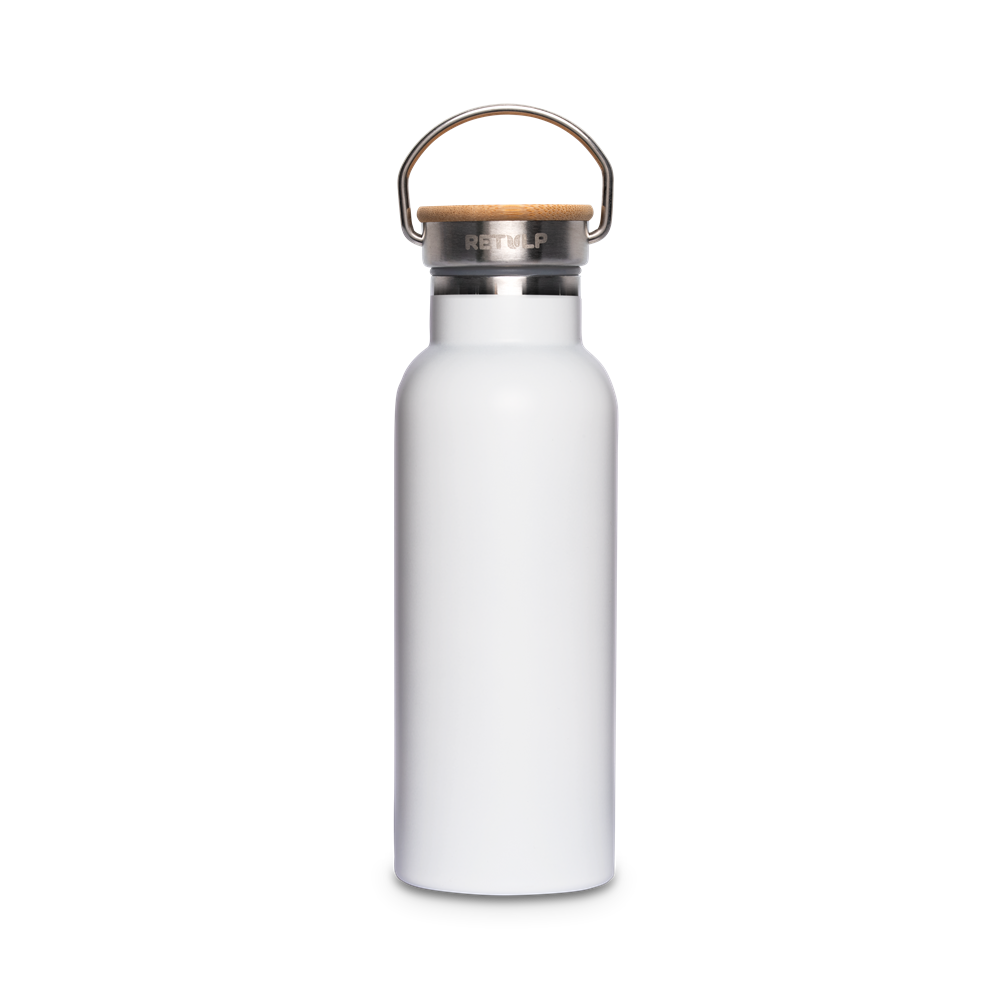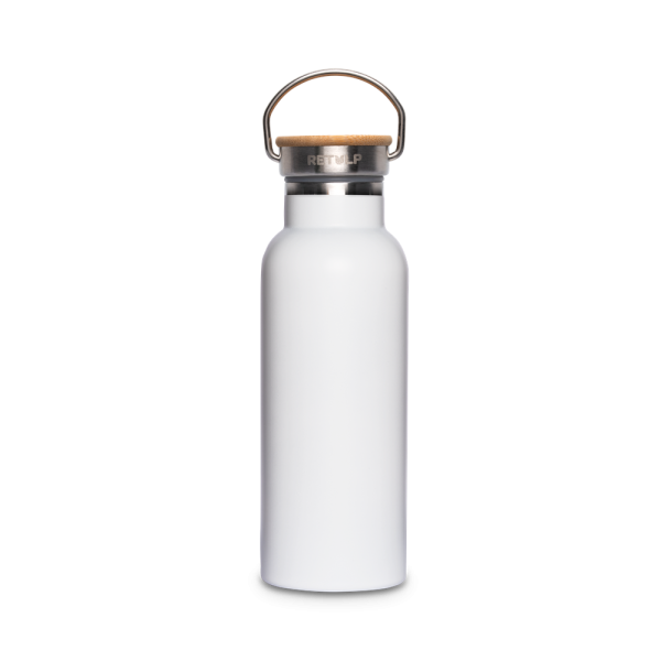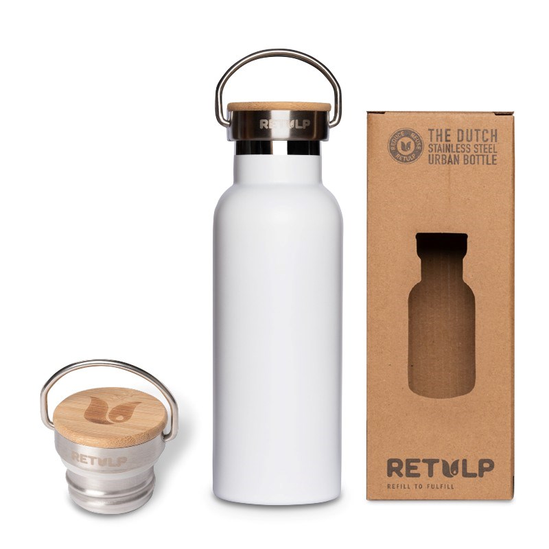 De Urban Thermos 500ml is een thermosfles van dubbelwandig RVS met een bamboe dop. Water en dranken uit een Retulp thermosfles smaken beter omdat er geen smaakoverdracht tussen de drank en het materiaal plaatsvindt. Een isolerende fles is een ideale upgrade voor degene die nooit meer zonder zijn fles op stap gaat. Nu blijven water en andere dranken ook lekker fris of juist warm. Omdat de fles geheel van roestvrijstaal is gemaakt is deze gemakkelijk te schoon te houden. De drinkfles is gemaakt van slijtvast, duurzaam en 100% recyclebaar materiaal. Een goed alternatief voor vervuilende plastic waterflessen. Bij iedere verkochte drinkfles doneert Retulp 1000 keer de inhoud aan schoon drinkwater in derdewereldlanden, dus met een Retulp drinkfles levert u een goede maatschappelijke bijdrage! De drinkflessen zijn vanaf 48 stuks te graveren of te bedrukken.