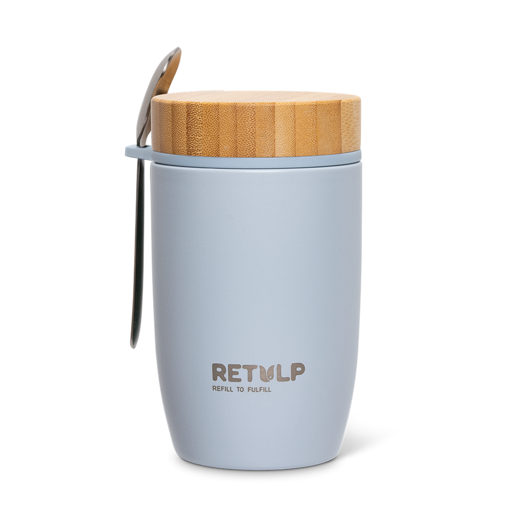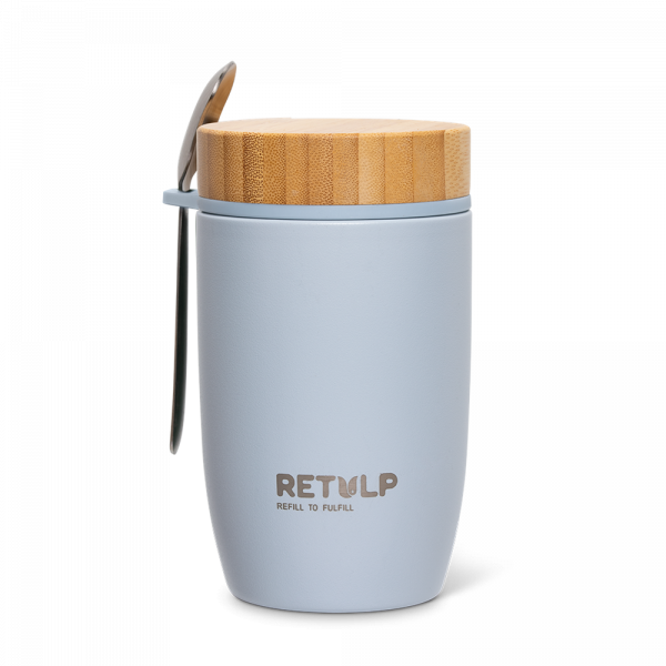 De Retulp Big Mug is een dubbelwandige, vacuümgeïsoleerde rvs lunchbox met schroefdop en een grote opening, waardoor deze gemakkelijk te vullen en te reinigen zijn. Eten en drinken uit een rvs-lunchbox smaakt lekkerder omdat er geen smaakoverdracht plaatsvindt tussen water en roestvrijstaal. De Retulp Big Mug is hierdoor ideaal voor het meenemen van bijvoorbeeld hete dranken, maar dient ook als yoghurtbeker, muesli beker of soepbeker. Bij elk verkochte lunch-to-go item wordt één boom gepland, dus met een Retulp lunch-to-go item levert u een goede maatschappelijke bijdrage! De Big Mugs zijn vanaf 20 stuks te graveren of te bedrukken.