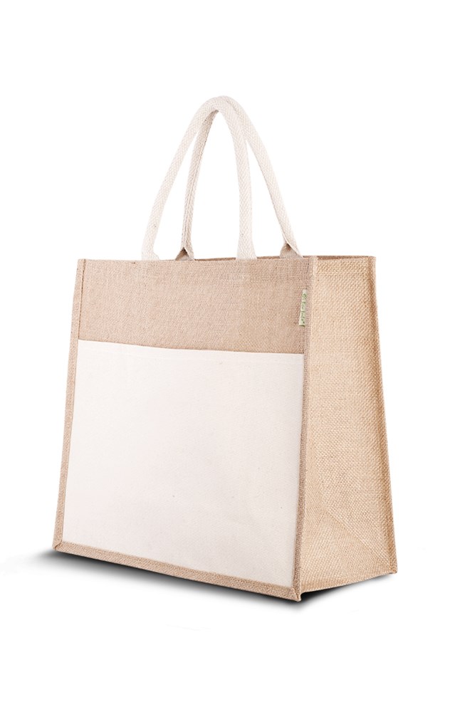 Jute (strand)tas Combi met katoenen vak aan één zijde. Voorzien van luxe gewatteerde katoenen hengsels. Duurzame ruime tas, zeer geschikt voor een dagje strand.